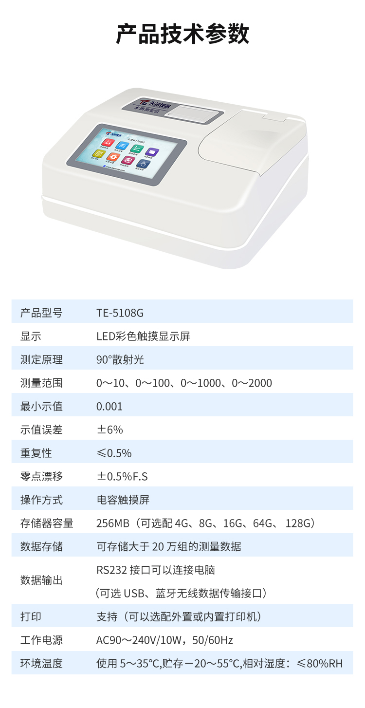 该仪器以高精度光纤检测系统为核心,采用散/透射光复合检测原理,搭配进口长寿命冷光源(使用寿命可达10万小时以上),波长定位精准至±1nm,在330-900nm宽光谱范围内可高效捕捉悬浮颗粒的光散射信号。其浊度检测范围覆盖0-200NTU,检测准确度≤±5%,重复性≤±2%,配合内置的光衰补偿算法与抗干扰设计,有效规避环境光、水体色度对检测结果的影响,数据稳定性远超传统光电检测设备。