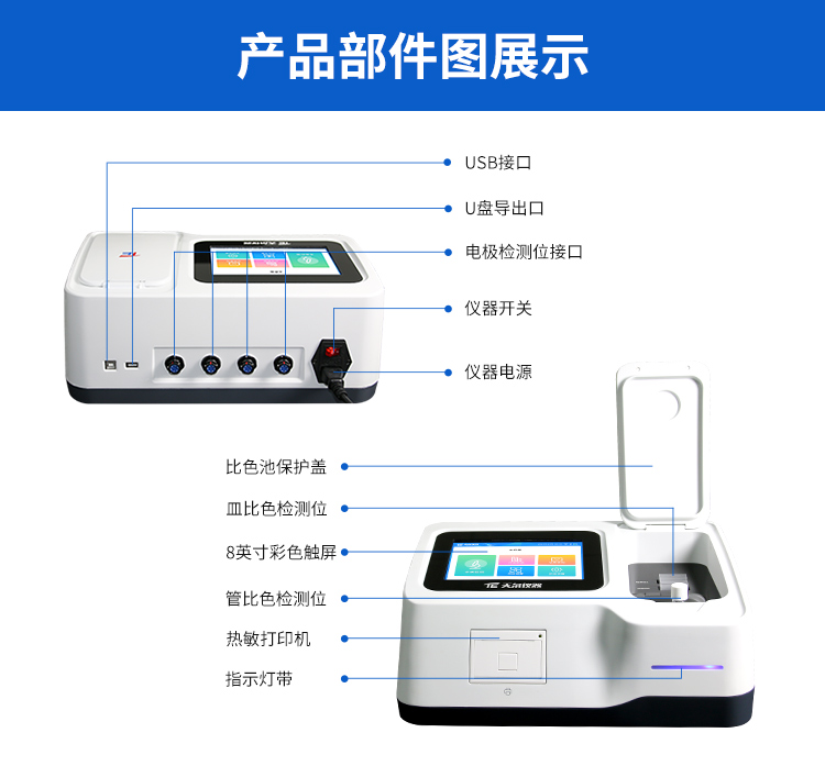 性能表现亮眼,检测准确度≤±5%,重复性≤±2%,360° 旋转比色管与多规格比色皿检测模式,有效消除系统误差。支持单点或多点校准,预存 1000 条曲线,可灵活适配不同检测标准。8 寸高清触摸显示屏搭配全中文引导界面,操作直观,数据合理性判断功能与指示灯带提示,降低操作失误率。