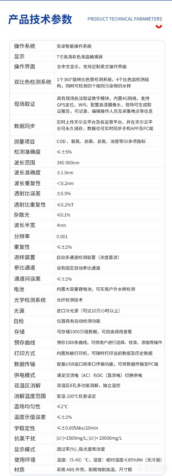 简单说:它是把实验室消解、检测、打印、取证、数据上传全部装进一个防水手提箱的全能型设备。不用接固定电源、不用带回实验室、不用复杂操作,户外就能一次性测COD、氨氮、总磷、总氮、重金属、浊度、色度等几十项指标,专门应对污水现场快速检测。